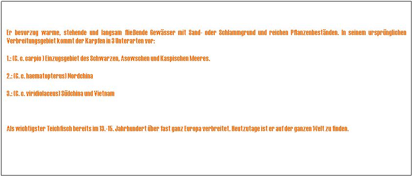 Er bevorzug warme, stehende und langsam fließende Gewässer mit Sand- oder Schlammgrund und reichen Pflanzenbeständen. In seinem ursprünglichen Verbreitungsgebiet kommt der Karpfen in 3 Unterarten vor: 1.: (C. c. carpio ) Einzugsgebiet des Schwarzen, Asowschen und Kaspischen Meeres. 2.: (C. c. haematopterus) Nordchina 3.: (C. c. viridiolaceus) Südchina und Vietnam