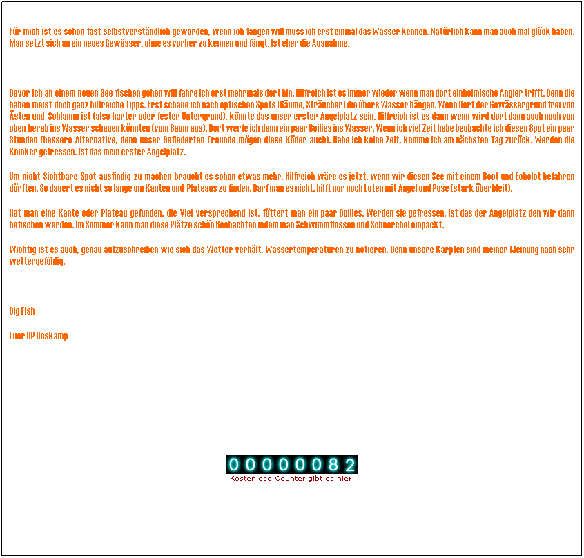 Bevor ich an einem neuen See fischen gehen will fahre ich erst mehrmals dort hin. Hilfreich ist es immer wieder wenn man dort einheimische Angler trifft. Denn die haben meist doch ganz hilfreiche Tipps. Erst schaue ich nach optischen Spots (Bäume, Sträucher) die übers Wasser hängen. Wenn Dort der Gewässergrund frei von Ästen und Schlamm ist (also harter oder fester Untergrund), könnte das unser erster Angelplatz sein. Hilfreich ist es dann wenn wird dort dann auch noch von oben herab ins Wasser schauen könnten (vom Baum aus). Dort werfe ich dann ein paar Boilies ins Wasser. Wenn ich viel Zeit habe beobachte ich diesen Spot ein paar Stunden (bessere Alternative, denn unser Gefiederten Freunde mögen diese Köder auch). Habe ich keine Zeit, komme ich am nächsten Tag zurück. Werden die Knicker gefressen. Ist das mein erster Angelplatz. Um nicht Sichtbare Spot ausfindig zu machen braucht es schon etwas mehr. Hilfreich wäre es jetzt, wenn wir diesen See mit einem Boot und Echolot befahren dürften. So dauert es nicht so lange um Kanten und Plateaus zu finden. Darf man es nicht, hilft nur noch Loten mit Angel und Pose (stark überbleit). Hat man eine Kante oder Plateau gefunden, die Viel versprechend ist, füttert man ein paar Boilies. Werden sie gefressen, ist das der Angelplatz den wir dann befischen werden. Im Sommer kann man diese Plätze schön Beobachten indem man Schwimmflossen und Schnorchel einpackt. Wichtig ist es auch, genau aufzuschreiben wie sich das Wetter verhält. Wassertemperaturen zu notieren. Denn unsere Karpfen sind meiner Meinung nach sehr wettergefühlig.